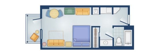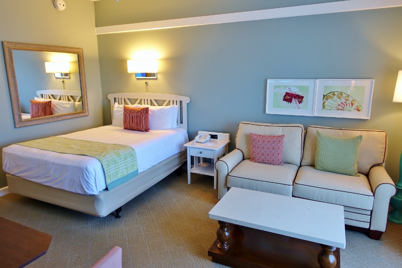 Studios sleep up to 5 with queen bed, sleeper sofa and murphy bed under the TV area. Also has a kitchenette